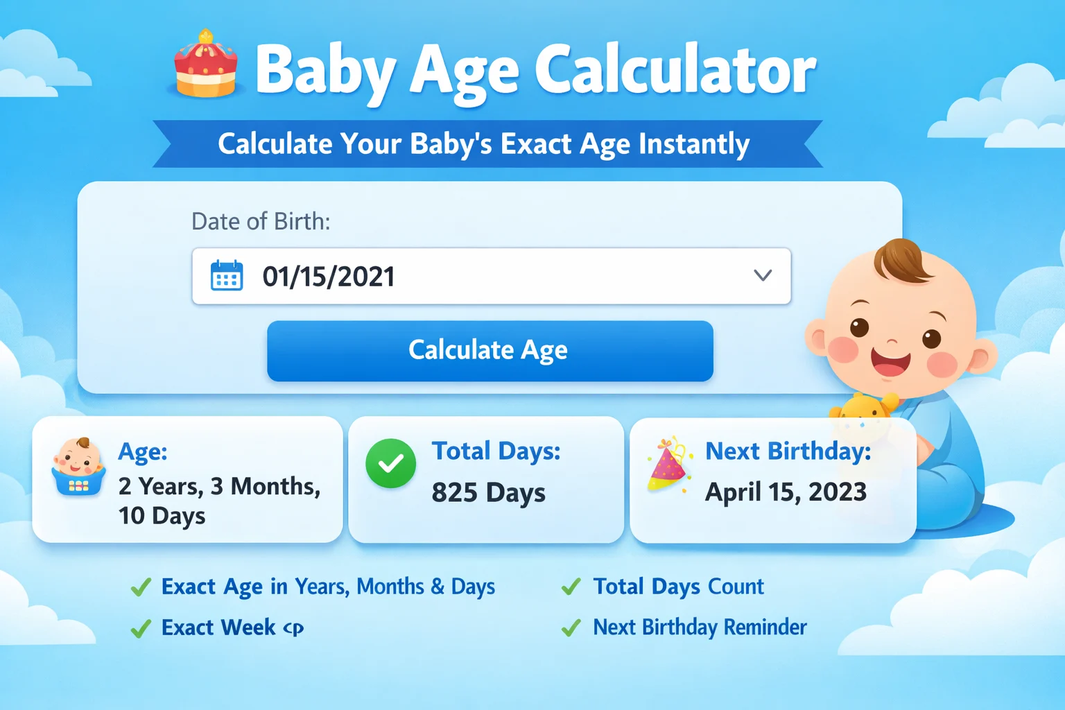 Our baby age calculator helps parents easily calculate their baby’s exact age in years, months, and days. Whether you want to track milestones or plan activities, knowing your baby’s precise age is important.